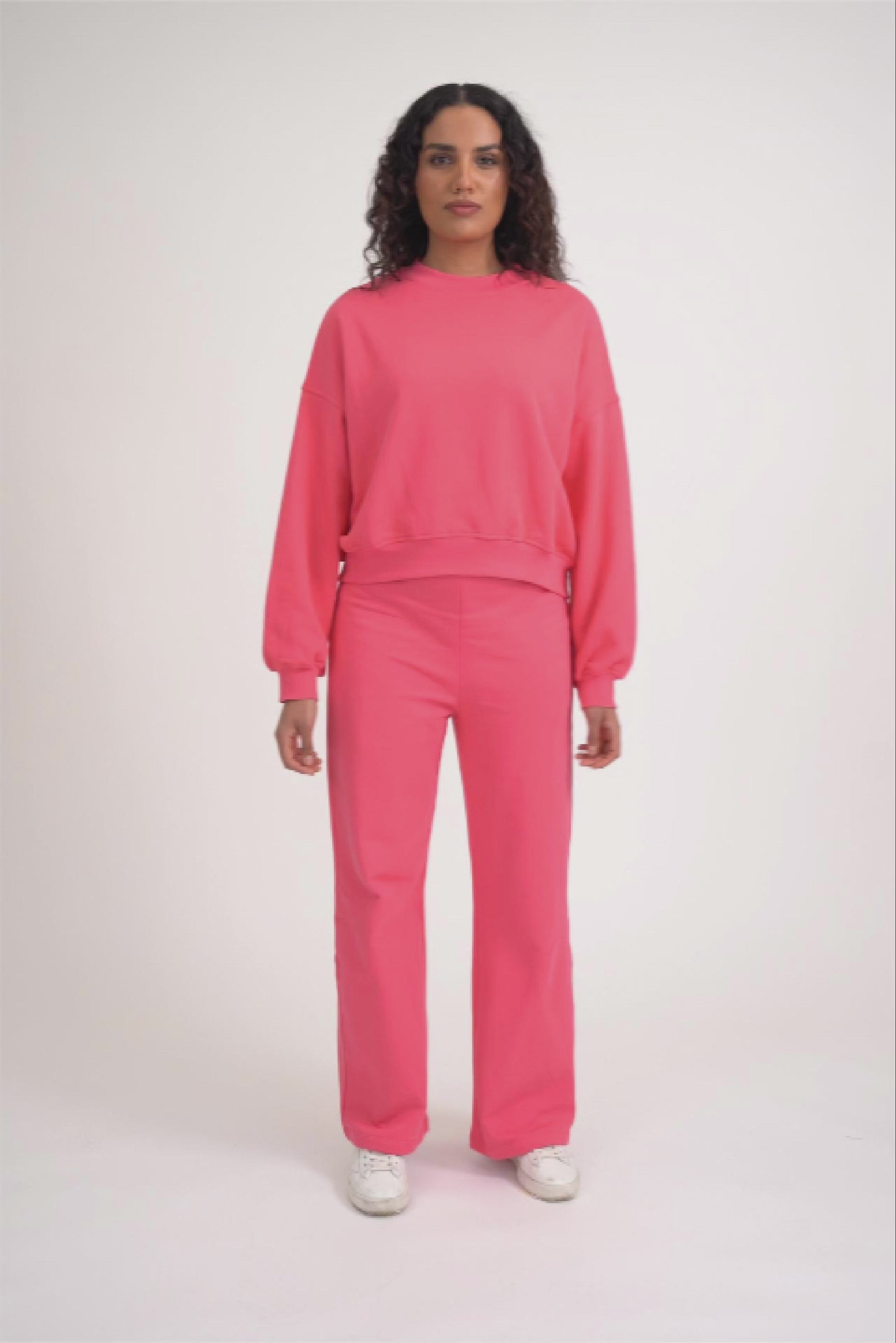 A feeling of softness and freshness for your most dynamic days. This tracksuit, combined with the crewneck sweatshirt, accompanies you comfortably throughout the day. The details of the elastic waistband give the model a stylish line.