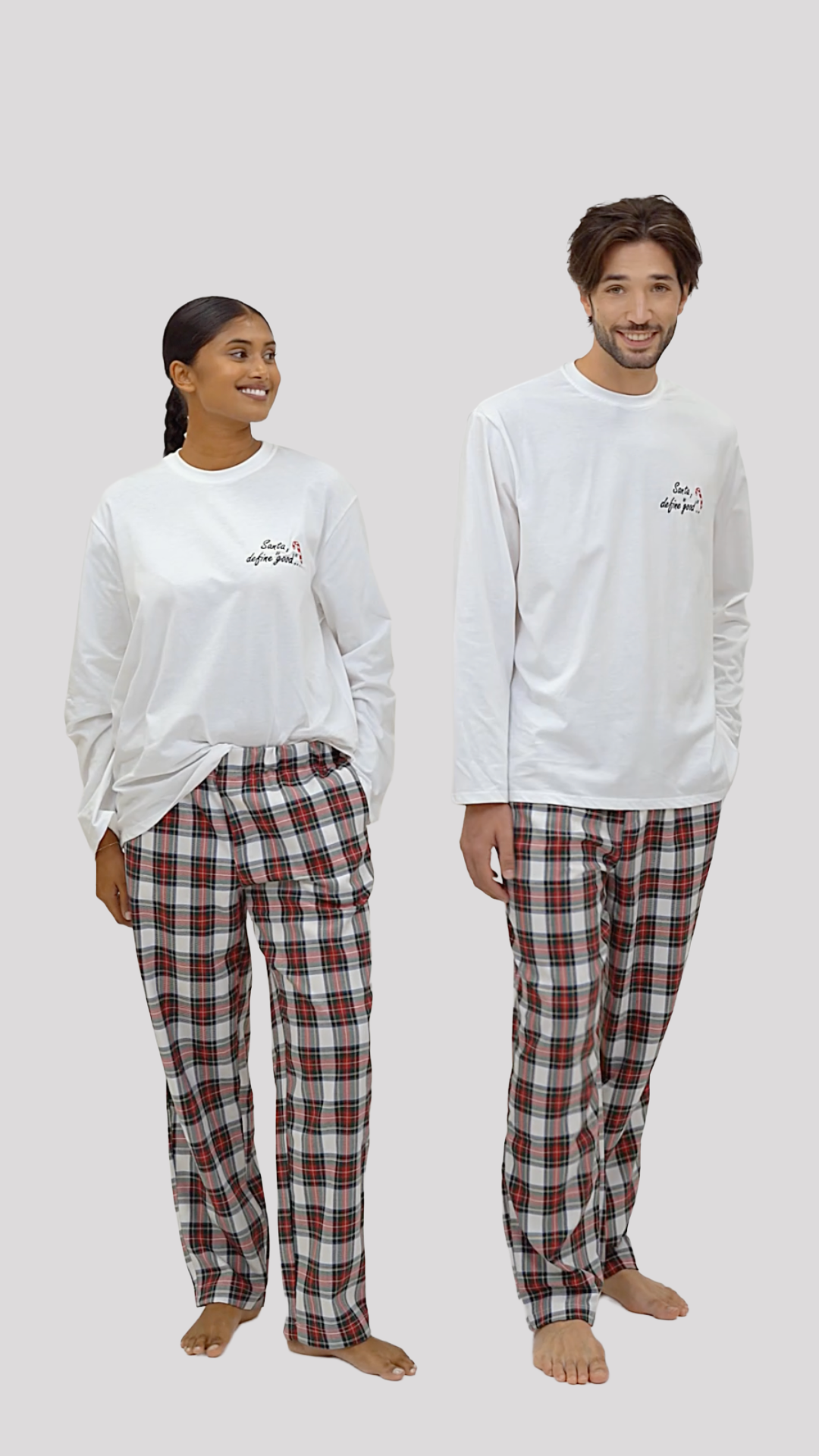 Pigiama unisex natalizio composto da maglia oversize con ricamo Santa, define "good"... e pantaloni in tartan con vita elastica e vestibilità confortevole. Disponibile anche in versione kids per look coordinati in famiglia.