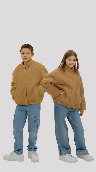 Giacca stile bomber in soffice tessuto teddy, pensata per avvolgere i più piccoli in un caldo abbraccio. È dotata di una pratica chiusura con bottoni interni automatici, due taschine frontali inclinate e un’imbottitura morbida rivestita da fodera satinata. I polsini e il fondo elasticizzati offrono una vestibilità comoda e libera nei movimenti. Un capo versatile, perfetto per aggiungere un tocco di morbidezza a qualsiasi outfit. Suggeriamo di acquistare una taglia superiore per garantire maggiore comfort.